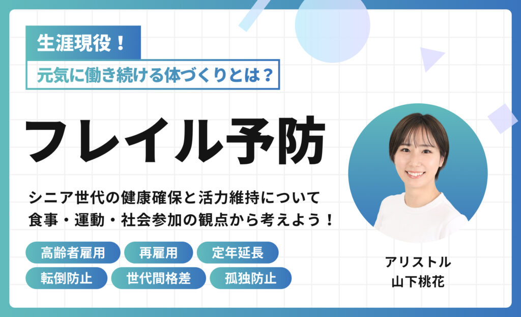 加齢とともに筋力や認知機能が低下し、健康と要介護の間の状態になることを「フレイル(虚弱)」と呼びます。適切に対処すれば元の健常な状態に戻ることができるこのフレイルを予防し、ベテラン社員が持つ経験や知識をいつまでも職場で発揮し続けてもらうための、3つの柱(栄養・身体活動・社会参加)について学びます。