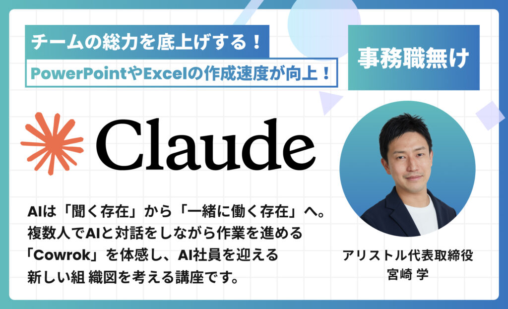 AIは「聞くもの」ではなく「一緒に働くもの」へ。Claudeの新機能を活用し、組織内のナレッジを共有しながら、複数人でAIと対話する「AI Coworking」の実践手法を学びます。企画会議の議事録作成から、プロジェクトの壁打ち、資料の共同作成まで、チーム全体の生産性を底上げする秘訣を伝授します。